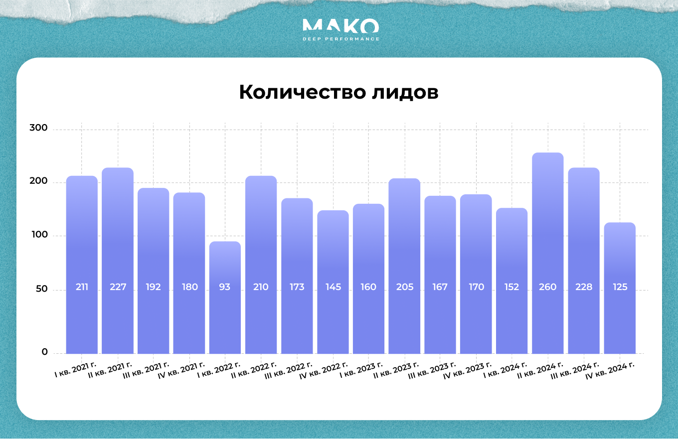 За 4,5 года количество лидов выросло в 2,5 раза ― со 110 за квартал на старте до 260 в 2024 году. Всего за это время было 2900 обращений. Компания стабильно получает минимум 2 целевые заявки в день от юрлиц и самозанятых, то есть в среднем 60 заявок в месяц.
