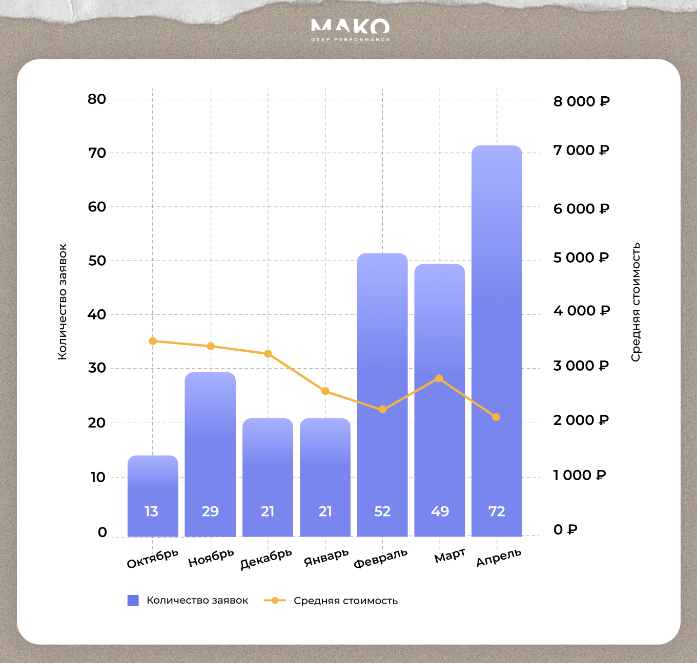 В первые месяцы ДСА стабильно приносили лиды по низкой цене — 68 обращений стоимостью около 3 000 рублей. С октября по февраль 2025 г. кампания работала нормально, но в марте эффективность резко снизилась — обращения застопорились. Перешли на стратегию с оплатой за клики, но она только увеличила стоимость конверсии до 6 000 рублей.